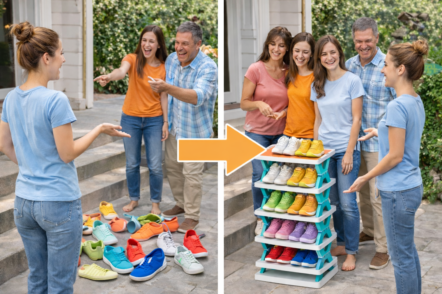 The standard 4-layer SmartStack Shoe Rack can hold 8–12 pairs depending on shoe size. Sports shoes, slippers, casual shoes, and sandals fit comfortably.